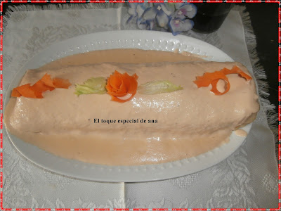 Humedecer un paño limpio con agua y poner encima del mármol,estiramos el puré de patatas en cima del paño. Picamos los huevos duros en dados y los mezclamos con la carne, ponemos el relleno encima del puré que tenemos ya estirado, dejamos unos cuatro dedos de pure sin el relleno para a la hora de darle forma de brazo, cojemos las dos puntas del paño y enrollamos con cuidado, cuando lo-tenemos enrollado lo ponemos en una fuente y le echamos por encima la salsa si es mucha la ponéis en una salsera. Decorar a vuestro gusto yo le hice como una flor de zanahoria. |